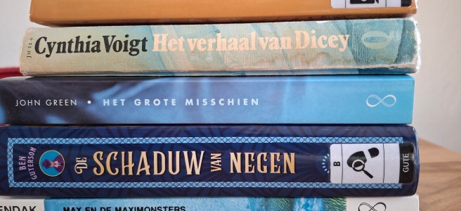 FEITJES F1 Julia en de haai / Kiran Millwood Hargrave F2 Hoe vang je een grote vis? / Hans Sibbel F3 De ongelooflijke (maar waargebeurde) heldendaden van Antar / Lydia Rood ; illustraties door Juliette de Wit F4 24 uur / Marcel van Driel F5 De BiebBoys beschuldigd! / Petra Mackenbach F6 Heksenwinter / Kaye Umansky (deel 3 heet: Heksenwinkel) F7 De terugstromende rivier: het verhaal van Tomek / Jean-Claude Mourlevat F8 Het jaar van Lente / Heather Fawcett F9 De wijde wereld in! / Jacques Vriens F10 Dodemansrit / M.G. Leonard & Sam Sedgman