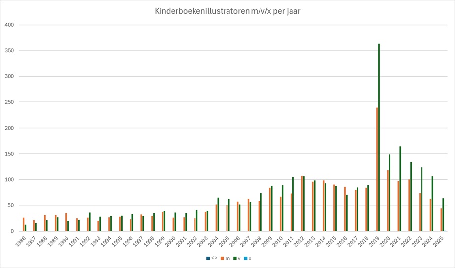 Ik was benieuwd hoe het zat met illustratoren. Veel voorwerk had ik al gedaan tijdens het onderzoek over schrijvers, dus ik hoefde alleen nog van enkele honderden boeken te bepalen of de illustrator man, vrouw of non-binair was. (Ik was verrast dat Bab Siljée een man was, ik had altijd gedacht dat Bab een vrouw zou zijn).