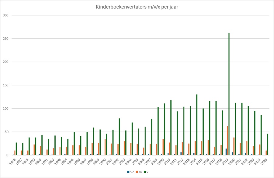 Het is duidelijk: vrouwen zijn in de meerderheid. Bij de schrijvers en illustratoren waren er nog wel jaren waarin mannen in de meerderheid waren, maar bij de vertalers is daar geen sprake van. Tot en met 2005 was de verhouding ongeveer 30%/70%, daarna werd het nog schever: ongeveer 20%/80%. Over de hele periode 1986-2025 is de verhouding man/vrouw/niet bekend 23,0%/74,9%/2,1%.