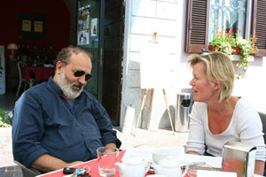 Mijn eerste echte zelfstandige vertaling was Toto Aroma, uitvinder van de pizza van Roberto Piumini. Hij is een zeer bekende Italiaanse kinderboekenschrijver en kwam op bezoek in een stadje bij ons vlakbij. Je ziet hem met mij op de foto. Ik was net met de vertaling bezig en worstelde met een uitdrukking in zijn boekje, die twee keer voorkwam. Ik had wel een vermoeden wat hij bedoelde maar ook mijn Italiaanse vrienden konden geen definitief uitsluitsel geven. Het was dus een uitgelezen gelegenheid om hemzelf te vragen wat hij er precies mee bedoelde. Hij begeleidde zijn antwoord met die typisch brede Italiaanse armgebaren en een grote glimlach en zei: ‘ach ik verzon zo maar wat.’ Hij was het eens met mijn voorgestelde interpretatie en het werd ‘Kom dan, pak me dan.’